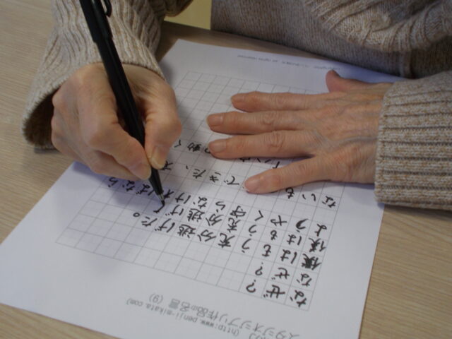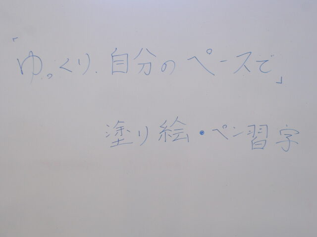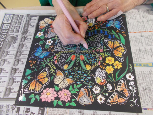 「ペン習字/塗り絵」プログラムではペン習字や細かい塗り絵の他、スクラッチアートも行われます