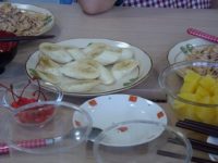 こんばんは、メンバーさんの希望で 今回はチョコレートパフェを作りました。 食材をあれこれ準備して当日の朝からメンバーさんはそわそわ。 午前中のプログラムで、パフェの絵を描いて待っている方もいました。 フルーツを切り、ホットケーキを焼き、生ク