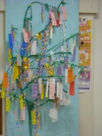 曇り空で今にも雨が降りそうな天気ですが、 今日は七夕です。 スタッフとメンバーさんの活躍により、笹から手作り。 皆さんで短冊を書きました。 叶うかな?叶うと良いな。